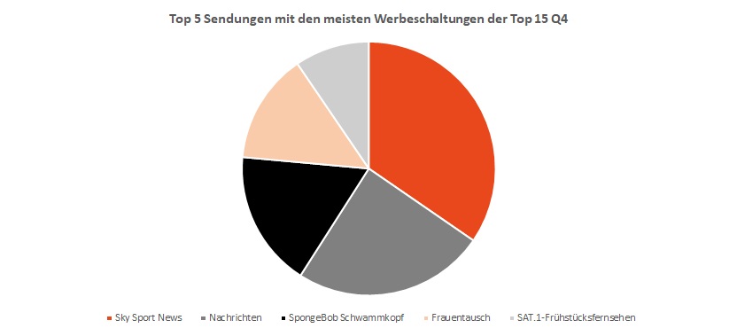 Die häufigsten Ausstrahlungen von TV-Spots und TV-Kampagnen der Top 15 gab es im vierten Quartal 2020 während Sky Sport News, den Nachrichten und SpongeBob Schwammkopf.