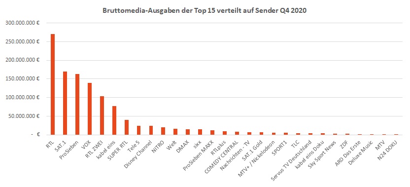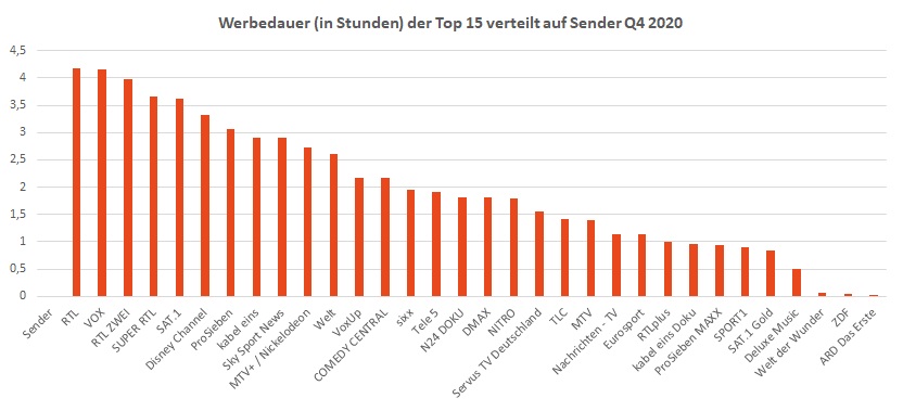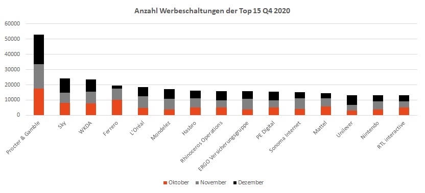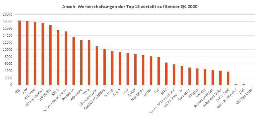 Die Top 15 der Unternehmen mit den meisten ausgestrahlten TV-Spots im Free-TV: Q4 2020