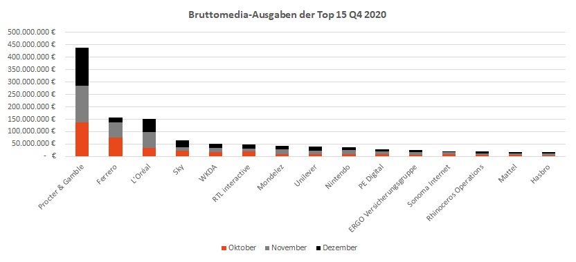 Betrachtet man die Bruttomedia-Ausgaben für TV-Spots und TV-Kampagnen, folgten auf Procter & Gamble Ferrero und L’Oréal, anschließend erst Sky und WKDA.