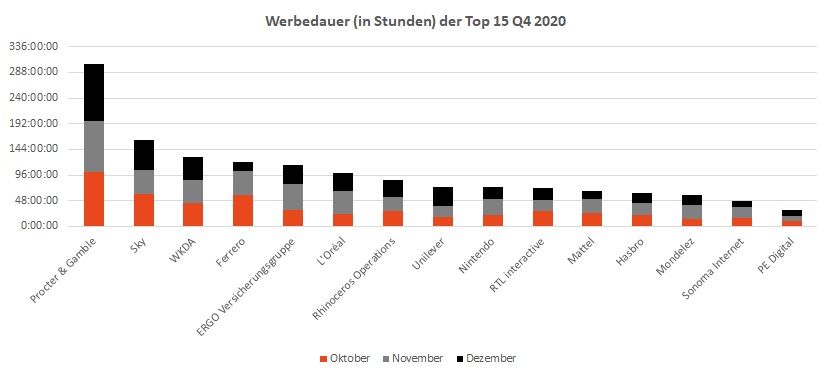 Beim Vergleich der zusammengerechneten Werbedauer aller TV-Spots und TV-Kampagnen ändert sich die Platzierung der Top 5 wieder leicht, hinter Procter & Gamble folgten Sky, WKDA, Ferrero und die Ergo Versicherungsgruppe.
