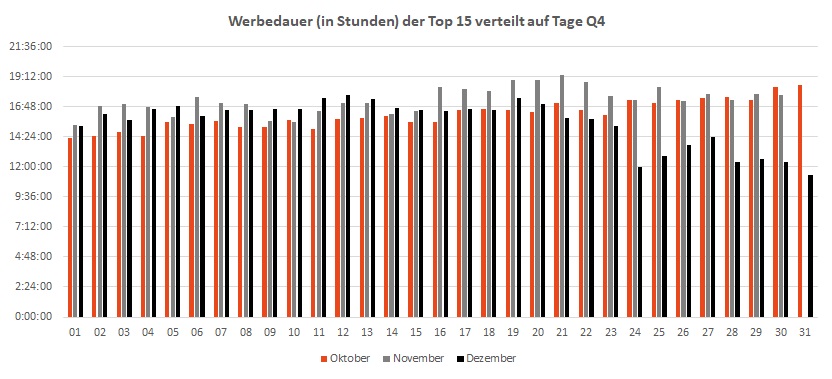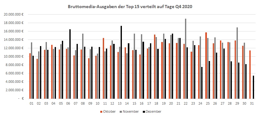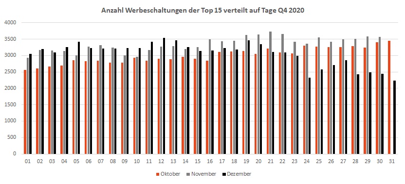 Bei der Verteilung der Ausstrahlungen der TV-Kampagnen und TV-Spots auf die einzelnen Tage und Monate zeigt sich über den Oktober ein Anstieg, der erst nach Weihnachten wieder merklich abnimmt.