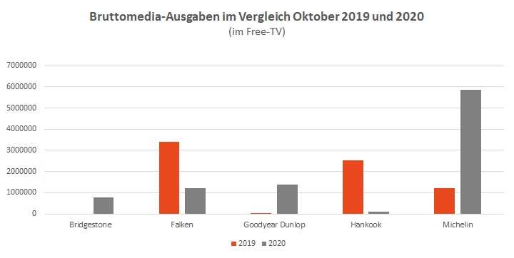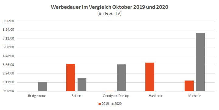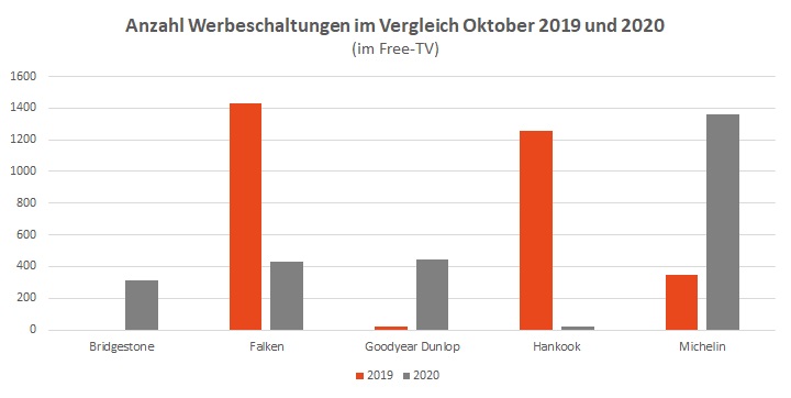 Im Oktober 2019 waren die meisten TV-Spots für Autoreifen von den Herstellern Falken, Hankook, Goodyear Dunlop und Michelin. Während Falken und Hankook ihre TV-Kampagnen im Oktober 2020 stark zurückschraubten, stieg die Anzahl der Ausstrahlungen an TV-Spots von Goodyear Dunlop und Michelin. Bridgestone schaltete im Gegensatz zum Vorjahr ebenfalls eine TV-Kampagne.