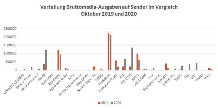 Bei der Verteilung der TV-Spots aus den TV-Kampagnen der Reifenhersteller zeigt sich ein großer Rückgang der Ausstrahlungen auf dem Sender Sport1, auf dem Oktober 2019 noch die meisten TV-Spots aus dem Reifensegment liefen.