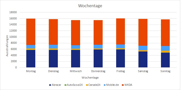 Bei der Verteilung auf die einzelnen Wochentage kristallisieren sich klar Samstag und Sonntag als ausstrahlungsstärkste Tage der TV-Kampagnen heraus. Ob diese TV-Planung in den nächsten Wochen trotz strak verändertem TV-Mediakonsum weiter eingesetzt wird?