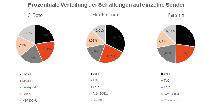 Die TV-Kampagnen der Datingplattformen wurden vorzugsweise auf Spartensendern platziert. Am beliebtesten waren hierbei die Sender Welt, TLC und Tele 5.